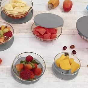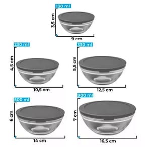 Descrição: pote de vidro com tampa em plástico, fácil de limpar, com 5 capacidades diferentes, ideal para armazenar variadas quantidades de alimentos. Pode ser utilizado para guardar diversos tipos de alimentos, facilitando a organização da cozinha. Adequado para uso em freezer e microondas, vidro resistente e com design contemporâneo. Jogo c/5 porta mantimentos de vidro tigelas potes com tampa
