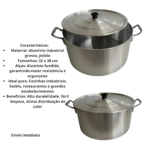 Jogo Caçarola Industrial 32/38 Alumínio Grosso Panela Hotel Kit de Panela Hotel nº 32/38 - Alumínio Industrial Grosso Polido com Alças em Alumínio Fundido Este Kit de Panela Hotel é ideal para em cozinhas industriais e comerciais. Fabricado em alumínio de alta qualidade, com espessura reforçada, oferece durabilidade, resistência e excelente condução de calor. Seu acabamento polido proporciona um visual sofisticado e facilita a limpeza, enquanto as alças em alumínio fundido garantem maior segurança e praticidade no manuseio. Características: Material: Alumínio industrial grosso, polido Tamanhos: 32 e 38 cm Alças: Alumínio fundido, garantindo maior resistência e ergonomia Ideal para: Cozinhas industriais, hotéis, restaurantes e grandes estabelecimentos Benefícios: Alta durabilidade, fácil limpeza, ótima distribuição de calor