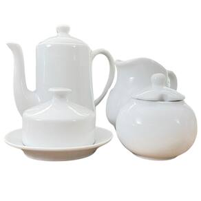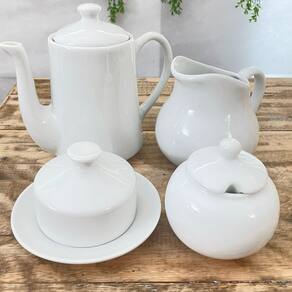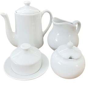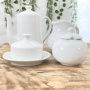 Jogo Café Chá Mesa Posta, Açucareiro 350ml + Jarra Leiteira 740ml + Manteigueira 150ml + Bule 1L - Kit Porcelana BrancaPeças de porcelana feitas de material de alta qualidade, queimados em alta temperatura, o que os torna fortes, resistentes e com alto brilho, e deixa qualquer ambiente mais bonito e moderno. A porcelana tem uma enorme vantagem sobre outros materiais, pois é fácil de limpar e não absorve cheiro, o que deixa a peça e o ambiente livre de mal cheiro.São resistentes ao forno e micro-ondas. Cor BrancaCapacidades:Açucareiro 350mlJarra Leiteira 740mlManteigueira- 250ml Bule - 1L Pode haver variação de tonalidade entre as peças devido a diferentes lotes de queima.Embalagem contêm 4 peças Marca: Antilope Decor Porcelanas