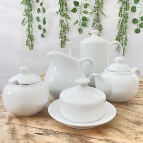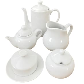 Jogo Café Chá Mesa Posta, Chaleira 500ml + Açucareiro 350ml + Jarra Leiteira 740ml + Manteigueira 150ml + Bule 1L - Kit Porcelana BrancaPeças de porcelana feitas de material de alta qualidade, queimados em alta temperatura, o que os torna fortes, resistentes e com alto brilho, e deixa qualquer ambiente mais bonito e moderno. A porcelana tem uma enorme vantagem sobre outros materiais, pois é fácil de limpar e não absorve cheiro, o que deixa a peça e o ambiente livre de mal cheiro.São resistentes ao forno e micro-ondas e lava louçasCor BrancaCapacidades:Chaleira 500mlAçucareiro 350mlJarra Leiteira 740mlManteigueira- 150ml Bule - 1L Pode haver variação de tonalidade entre as peças devido a diferentes lotes de queima.Embalagem contêm 5 peças Marca: Antilope Decor Porcelanas