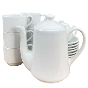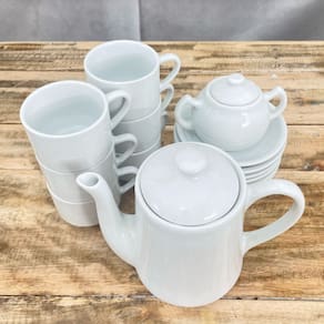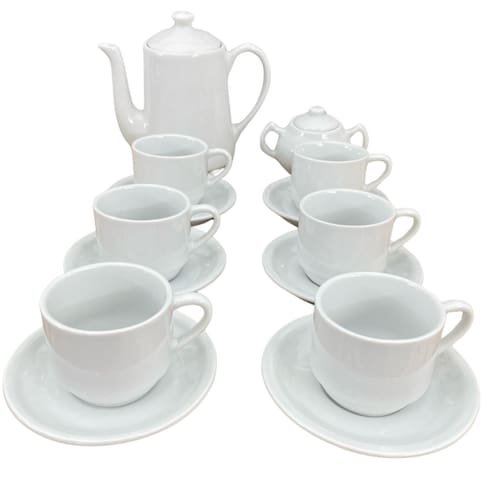 Jogo Café e Chá Mesa Posta 14 peças - Bule 1L + Açucareiro 250ml + 6 xícaras café/chá 200ml empilháveis c/ pires Peças de porcelana feitas de material de alta qualidade, queimados em alta temperatura, o que os torna fortes, resistentes e com alto brilho, e deixa qualquer ambiente mais bonito e moderno.A porcelana tem uma enorme vantagem sobre outros materiais, pois é fácil de limpar e não absorve cheiro, o que deixa a peça e o ambiente livre de mal cheiro.São resistentes ao forno e micro-ondas.Cor BrancaCapacidades:Bule: 1L Açucareiro Chaleira: 250mlXícaras: 200ml São empilháveis, o que torna o armazenamento mais práticoOBS: Pode haver variação de tonalidade entre as peças devido a diferentes lotes de queima.Embalagem contêm 14 peças (1 açucareiro, 1 bule chaleira, 6 xícaras, 6 pires) Marca: Antilope Decor Porcelanas