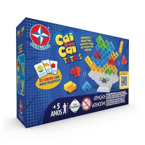 O Jogo Cai Não Cai Tetris da Estrela é uma opção perfeita para quem busca diversão e entretenimento em família ou com amigos. Um jogo dinâmico e divertido, com muita emoção! Existem modos de jogos com ou sem o uso das cartas. Os jogadores devem encaixar as peças do tetris na base bamba de forma estratégica para conseguir equilibrá-las. O foco deve ser sempre equilibrar as peças na base considerando seus tamanhos e pesos. Aquele que colocar uma peça que desequilibre a base e faça com que as peças caiam, é eliminado do jogo! Esse modelo de jogo, pode também ser jogado utilizando as 22 cartas que acompanham o jogo, dessa forma os jogadores devem retirar uma carta e realizar o que se pede nela, existem ações de encaixar peças com formatos ou cores específicas, e cartas que pedem que o jogador retire peças da base, trazendo ainda mais emoção e dificultando o jogo! É possível jogar com 2 ou mais jogadores, ou até mesmo individualmente! Idade recomendada: A partir de 5 anos. Selo Inmetro: 000 135/2023.