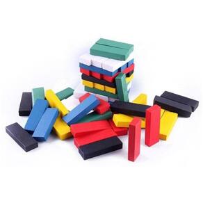 Conteúdo da embalagem: 60 blocos em madeira MDF, coloridos, verde, vermelho, amarelo e marron. Tamanho de cada bloco: 7,5 cm x 1,5 cm