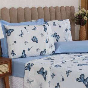 Jogo de Cama Casal 4p Lençol + Fronha Esmeralda Percal 100% Algodão Cor: Borboleta azul Mais beleza para o seu dia a dia e conforto para as suas noites de sono.