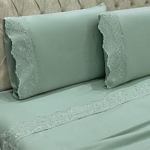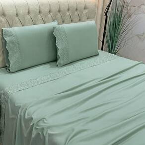 Jogo Cama Lençol Detail Casal Padrão Bordado Guipir Bordado Inglês Percal 300 Fios 4 Peças - Verde Menta O Jogo de Cama Lençol Detail é a escolha perfeita para quem busca elegância e conforto em cada detalhe. Feito em Percal de Poliéster 300 Fios, traz a suavidade e o toque acolhedor de algodão para noites de sono agradáveis e revigorantes. Seu design sofisticado com bordado inglês adiciona charme ao quarto, elevando a decoração com um toque clássico. Além disso, o lençol de baixo com elástico garante um ajuste perfeito ao colchão, proporcionando praticidade e durabilidade. Transforme seu quarto em um ambiente aconchegante e sofisticado com o Jogo de Cama Detail