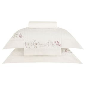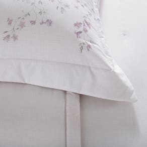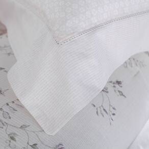 Os delicados florais aquarelados em tons suaves de lilás, aplicados sobre um fundo com textura de mosaicos, criam uma composição charmosa e sofisticada. A vira do sobrelençol e as fronhas ganham ainda mais requinte com os acabamentos em ponto ajour, um detalhe clássico que valoriza a estética da cama e eleva a decoração do quarto.