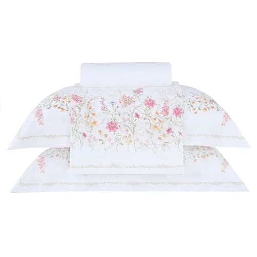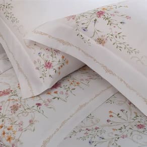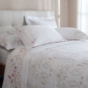 A vira do sobrelençol e as fronhas ganham destaque com buquês elegantes emoldurados por elementos clássicos, elevando o nível da decoração do quarto e criando um ambiente acolhedor, luxuoso e atemporal.