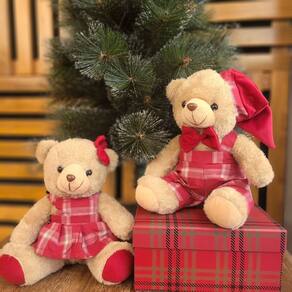 Encante sua decoração natalina com este Jogo Casal de Urso de Pelúcia marrom claro, vestido com roupa em xadrez e lacinho vermelho, que traz um toque delicado e cheio de charme para o ambiente. Uma peça perfeita para compor cenários aconchegantes e transmitir a verdadeira magia do Natal.