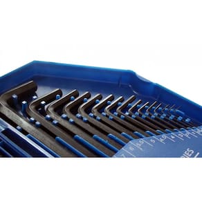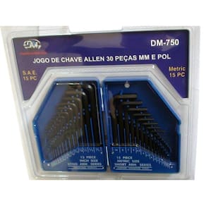 Jogo de chaves allen Forjadas em aço cromo vanádio Acabamento oxidado Possui os tamanhos mais diversos para sua necessidade Acompanha estojo organizador em plástico reforçado Composto por 30 peças, com as seguintes medidas:15 Chaves em milímetros: 0,7 0,9 1,3 1,5 2,0 2,5 3,0 4,0 4,5 5,0 5,5 6,0 7,0 8,0 10,0 mm15 Chaves em polegada: 0,028 0,035 0,050 1/16 5/64 3/32 7/64 1/8 9/64 5/32 3/16 7/32 1/4 5/16 3/8 Marca: DM Ferramentas Marca: Dm Ferramentas E Equipamentos Automotivos