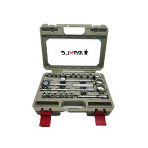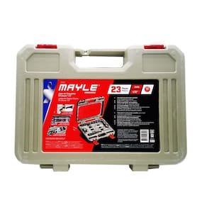 - Jogo chave catraca com soquete 23 peças Mayle. - Fabricado em cromo-vanádio. - Acabamento polido para fácil limpeza. - Estojo organizador em termoplástico e berço com identificação de medidas. - 2 Nichos para guardar objetos. - Visor transparente para fácil visualização das ferramentas. - 1 chave catraca reversível de 1/2" com 25 cm comprimento. - 1 Cabo de força 1/2" com 25 cm. - 1 extensão de 1/2" com 25cm. - 1 extensão de 1/2" com 12 cm. - 18 soquetes sextavados: 8, 9, 10, 11, 12, 13, 14, 15, 16, 17, 18, 19, 21, 22, 24 , 27, 30, 32mm.