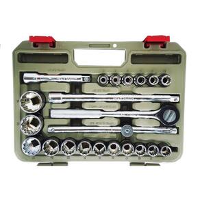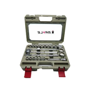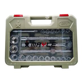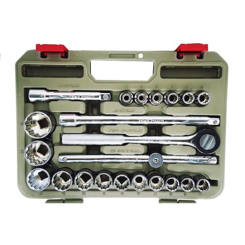 - Jogo chave catraca com soquete 23 peças Mayle. - Fabricado em cromo-vanádio. - Acabamento polido para fácil limpeza. - Estojo organizador em termoplástico e berço com identificação de medidas. - 2 Nichos para guardar objetos. - Visor transparente para fácil visualização das ferramentas. - 1 chave catraca reversível de 1/2" com 25 cm comprimento. - 1 Cabo de força 1/2" com 25 cm. - 1 extensão de 1/2" com 25cm. - 1 extensão de 1/2" com 12 cm. - 18 soquetes sextavados: 8, 9, 10, 11, 12, 13, 14, 15, 16, 17, 18, 19, 21, 22, 24 , 27, 30, 32mm.