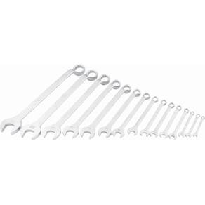 1 Jogo de chaves combinadas, composto por um suporte plástico com 15 peças, sendo: 6 mm, 7 mm, 8 mm, 10 mm, 11 mm, 12 mm, 13 mm, 14 mm, 17 mm, 19 mm, 22 mm, 24 mm, 27 mm, 30 mm e 32 mm
