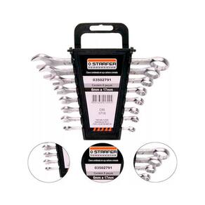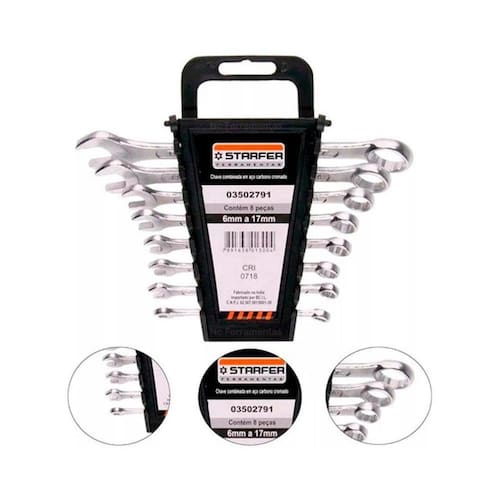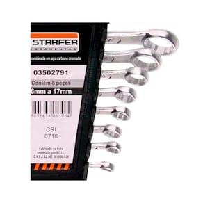 Descrição Jogo chave combinada boca estrela 6 a 17mm resistente 8 pcs é indicada para apertar e afrouxar parafusos ou porcas com perfil quadrado ou sextavado. Para perfeito funcionamento é importante usar a chave de tamanho compatível com a cabeça da porca ou parafuso. Detalhes 01 jogo de chave combinada cromo vanádio 6- 17 mm starfer Tamanho das chaves: 6, 7, 8, 9, 10, 11, 14, 17mm Especificações Com essa chave, o portador tem o melhor das duas chaves: fixa e combinada, carregando duas ferramentas em apenas uma. Características Proporciona maior praticidade, pois com apenas um jogo de ferramentas é possível realizar diversos trabalhos.As imagens são meramente ilustrativas Ean: 7898704410842