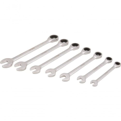 1 Jogo de chaves combinadas com catraca, composto por um estojo plástico com 7 peças, sendo: 8 mm, 10 mm, 12 mm, 13 mm, 14 mm, 17 mm e 19 mm