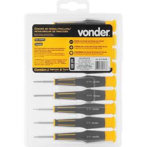 Jogo chave fenda/phillips/hexalobular precisao 9 pecas vd 3570100090 Conteúdo da embalagem: 1 jogo de chaves de precisão, composto por um estojo plástico com 9 peças, sendo: 3 fenda 1,5 mm x 25 mm, 2,0 mm x 25 mm e 2,5 mm x 25 mm , 3 hexalobular t5 x 25 mm, t6 x 25 mm e t7 x 25 mm e 3 phillips ph1 x 25 mm, ph0 x 25 mm e ph00 x 25 mm Indicado para relojoarias, eletrônicas, serviços de precisão, entre outros Possui haste em aço carbono cromado e cabo anatômico que confere maior aderência e transmissão de força e apoio superior giratório que facilita a execução do trabalho Número de peças no jogo: 9 peças cdc : legal: 90 dias Marca: Não Informado Ean: 7893946564766