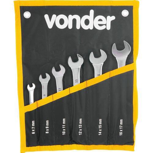 1 Jogo de chaves fixas composto por estojo em lona com 6 chaves, sendo: 6 mm x 7 mm, 8 mm x 9 mm, 10 mm x 11 mm, 12 mm x 13 mm, 14 mm x 15 mm e 16 mm x 17 mm