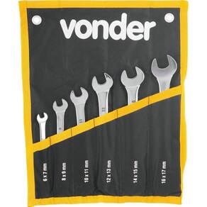 1 Jogo de chaves fixas composto por estojo em lona com 6 chaves, sendo: 6 mm x 7 mm, 8 mm x 9 mm, 10 mm x 11 mm, 12 mm x 13 mm, 14 mm x 15 mm e 16 mm x 17 mm
