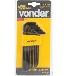 Descrição Chave torx jogo com 7 pçs t10 a t40 vtx-5 cod. 35.73.010.040 vonder 1 jogo de chaves hexalobular, composto por um suporte plástico com 7 peças, sendo: t10 - t15 - t20 - t25 - t27 - t30 e t40 Indicado para fixar e soltar parafusos hexalobular Produzido em aço cromo vanádio, proporcionando maior resistência e durabilidade. Possui ainda furo guia, que confere encaixe perfeito em parafusos que tenham este guia. Pode ser utilizada normalmente também em parafusos que não tenham este guia. Material do corpo da chave: aço cromo vanádio Acabamento da chave: fosfatizado preto Ean: 7893946084226