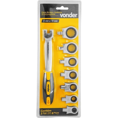Conteúdo da embalagem: 1 Chave estrela com 7 catracas intercambiáveis nas medidas: 8 mm, 10 mm, 12 mm, 13 mm, 14 mm, 17 mm e 19 mm.