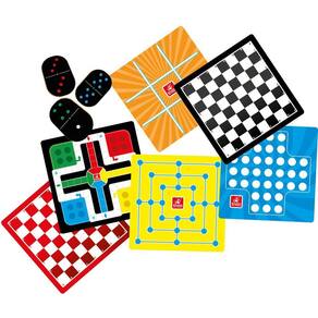 Contém: 3 tabuleiro frente e verso, 28 peças de dominó, 24 de dama, 16 de ludo, 32 de resta 1, 32 de xadrez e 12 de jogo da velha.