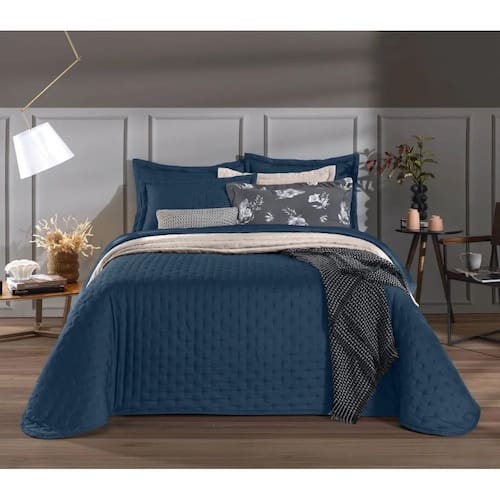 Nesse jogo você adquire: 1 cobre leito com detalhes da costura em relevo e 2 portas travesseiros, com os mesmos detalhes em relevo, possuindo 3 abas em sua volta.