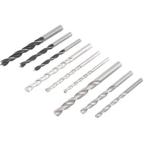 Jogo composto por: 1 maleta, 1 furadeira, 1 chave para mandril, 1 limitador de profundidade, 1 punho auxiliar, 1 esmerilhadeira, 1 capa de proteção, 1 punho auxiliar, 1 chave dois pinos, 3 brocas de aço rápido, 3 brocas três pontas para madeira, 3 brocas com ponta de metal duro/vídea e 1 disco de corte