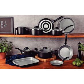 Praticidade, eficiência e alta qualidade com o jogo de panelas Tramontina Turim em alumínio com revestimento interno e externo em antiaderente Starflon Max preto 10 peças. Ideais para lhe acompanharem no preparo das refeições diárias, suas peças tem corpo de alumínio com espessura que proporciona cozimento rápido e uniforme e contam com revestimento interno e externo de antiaderente Starflon Max, material que não gruda, é fácil de limpar e mais durável. As panelas e as caçarolas que compõem o jogo contam com tampas de vidro temperado com bordas de aço inox e pegadores de nylon e todos os itens tem seus cabos ou alças em baquelite, material antitérmico que confere um manuseio confortável e mais seguro. Todas as peças podem ir à máquina de lavar louças e serem utilizadas nos fogões a gás, elétricos e vitrocerâmicos. Acompanha 1 unidade de cada item relacionado abaixo: Assadeira Rasa 28 cm 2 L Assadeira Redonda 22 cm 1,7 L Brasil Caçarola 18 cm 2 L Turim Caçarola 20 cm 2,8 L Turim Fervedor 12 cm 1,1 L Turim Frigideira 16 cm 0,4 L Turim Frigideira 20 cm 0,8 L Turim Panela 14 cm 0,8 L Turim Panela 16 cm 1,4 L Turim Panquequeira/ Tapioqueira 22 cm 0,6 L Turim Ean: 7891112332980