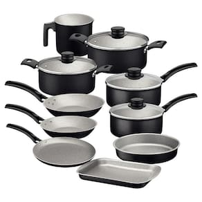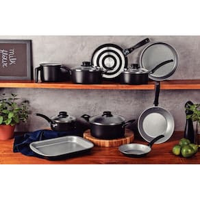 Praticidade, eficiência e alta qualidade com o jogo de panelas Tramontina Turim em alumínio com revestimento interno e externo em antiaderente Starflon Max preto 10 peças. Ideais para lhe acompanharem no preparo das refeições diárias, suas peças tem corpo de alumínio com espessura que proporciona cozimento rápido e uniforme e contam com revestimento interno e externo de antiaderente Starflon Max, material que não gruda, é fácil de limpar e mais durável. As panelas e as caçarolas que compõem o jogo contam com tampas de vidro temperado com bordas de aço inox e pegadores de nylon e todos os itens tem seus cabos ou alças em baquelite, material antitérmico que confere um manuseio confortável e mais seguro. Todas as peças podem ir à máquina de lavar louças e serem utilizadas nos fogões a gás, elétricos e vitrocerâmicos. Acompanha 1 unidade de cada item relacionado abaixo: Assadeira Rasa 28 cm 2 L Assadeira Redonda 22 cm 1,7 L Brasil Caçarola 18 cm 2 L Turim Caçarola 20 cm 2,8 L Turim Fervedor 12 cm 1,1 L Turim Frigideira 16 cm 0,4 L Turim Frigideira 20 cm 0,8 L Turim Panela 14 cm 0,8 L Turim Panela 16 cm 1,4 L Turim Panquequeira/ Tapioqueira 22 cm 0,6 L Turim Marca: Não Informado