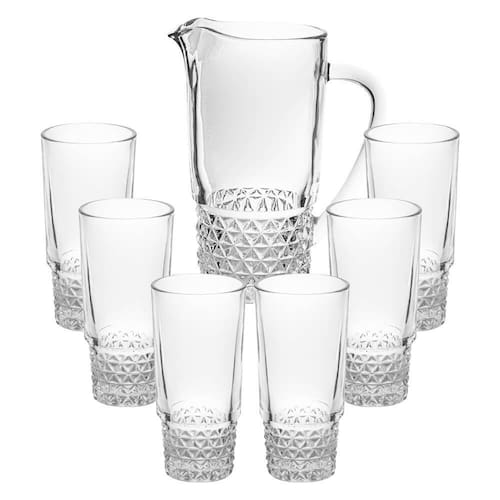 O jogo de copos de vidro, junto com a jarra combinam perfeitamente, enriquecendo a beleza de sua mesa posta e impressionando todos os seus convidados.