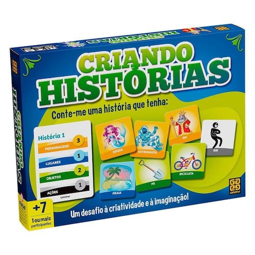 Criando HistóriasCriando histórias traz uma atividade divertida que vai estimular a criatividade das criançasElas devem criar e contar histórias usando as cartelas sorteadas, que possuem diferentes categorias: personagens, objetos, lugares e ações.Contém: 8 cartas-história72 cartelas1 manualEspecificações:Certificação: ?ce-Bri/icepex-N 01264-25Numero De Jogadores: ?1Montagem Necessária: ?nãoTipo s De Material: ?papelIdioma: ?portuguêsDimensões Do Produto: ?4.3 X 30.9 X 23.3 Cm; 400 GIdade Recomendada: ?6 Anos E AcimaNumero De Unidades: ?1Marca: ?grow