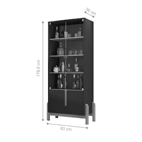 Elaborado em MDF, MDP. Laterais em MDF 25mm, portas e base MDF 15mm. Tampo e prateleiras MDP 15mm.