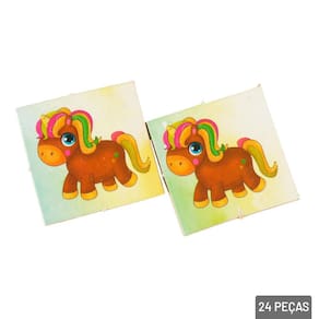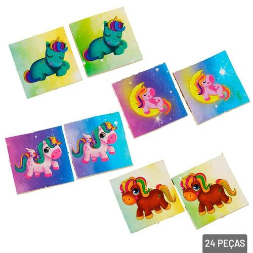 Jogo da Memória 24 Peças Unicórnio O Jogo da Memória é uma opção encantadora para estimular o desenvolvimento cognitivo das crianças enquanto elas se divertem com um tema lúdico e mágico. Com ilustrações de unicórnios, estrelas e elementos encantados, esse jogo é perfeito para crianças que amam fantasia e aventuras imaginativas. Ao combinar diversão e aprendizado, o Jogo da Memória Unicórnio é uma maneira divertida e educativa de melhorar a memória, a concentração e o reconhecimento de padrões.\nAs peças do Jogo da Memória Unicórnio são feitas de material resistente, com acabamento seguro e durável, ideal para suportar o uso constante por crianças. As peças são leves e fáceis de manusear, garantindo uma experiência de jogo agradável e segura. Jogo é simples e intuitivo, adequado para crianças a partir de 3 anos. As regras são fáceis de entender, permitindo que até os mais novos aproveitem a experiência sem dificuldade, o que o torna uma opção acessível e divertida para toda a família.\nEspecificações:\nMarca : BRINC\nTipo de material : Madeira\nCores ou Estampa : Colorido\nDimensões do Produto : 19 X 24 X 4 CM\nDimensões da Embalagem : 19 X 24 X 4 CM\nPeso Bruto (Gramas) : 0.017 Marca: Não Informado