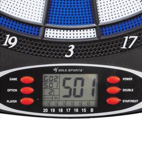 JOGO DARDOS GOLD SPORTS ELETRÔNICO 43CM - Dimensões da Peça:• Tabuleiro: 37,8 x 2 x 43cm• Dardos: 14,4 x 3,5 x 3,5cm- Dimensões da Embalagem: 38,8 x 3 x 44cm - Material: PP, ABS - Marca: Gold Sports - Origem: China - Contém:• 1 Tabuleiro;• 6 Dardos; - Este produto não é um brinquedo. Uso destinado somente e adultos - Jogos de dardos eletrônico com display LCD; - Com um total de 18 estilos e 159 jogos emocionantes. - Para até 8 jogadores - Funciona com 3 pilhas AA de 1,5V. (não inclusas). - Garantia: 30 dias contra defeito de fabricação Marca: Não Informado