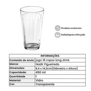 Esse belíssimo Jogo de 18 copos em vidro long drink Americano 450ml Incolor, vai super bem com qualquer tipo de decoração graças ao seu aspecto clássico, que combina com tudo, vai ornar perfeitamente com os demais utensílios que você tem. Ele vai ser perfeito para usar no dia a dia ou quando for receber as visitas em casa. Fabricado em vidro de qualidade esse copo apresenta uma excelente resistência.Esse jogo contém;18 unidades do Copo em vidro long drink Americano 450ml IncolorInformações Importantes;Medidas aproximadas de cada copo - 8,4 x 14,2cm Diâmetro x Altura Capacidade - 450mlComposição - VidroPeso individual - 0.28kgCor - TransparenteValidade - IndeterminadaConteúdo do envio - 1 unidade do Jogo de 18 copos em vidro long drink Americano 450ml IncolorFabricante - Nadir FigueiredoProduto 100% nacionalMais Informações;Evite pancadas ou impactos pois podem trincar, lascar ou danificar o produto.Pode ser lavado em lava louças.Ao lavar use de preferência detergente neutro, esponja macia e enxague com água em abundância. Jogo de 18 copos em vidro long drink Americano 450ml Incolor