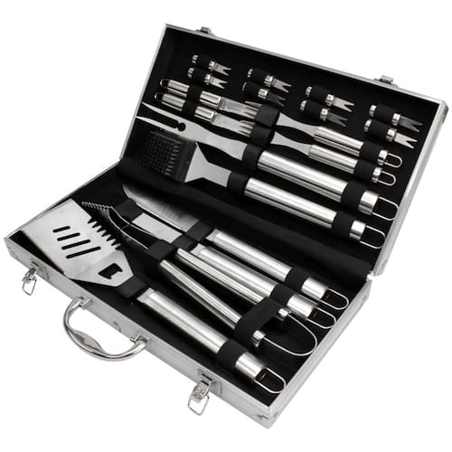 Confira nosso Jogo de 19 Peças para Churrasco Gourmet em Aço Inox com Maleta de Alumínio da Fracalanza que vai elevar o patamar das suas tardes de churrasco!