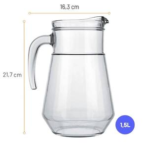 Garantia: 90 dias / Peso: 4,98kg / Cor predominante: transparente / Referência: 7891155012825X6 Dimensões: 16,3cm (C) x 13,7cm (L) x 21,7cm (A); Conteúdo do jogo: 6 jarras; Capacidade: 1,5l; Material: vidro. Aviso: supervisionar o uso pelas crianças.