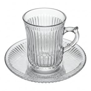 - Material: Vidro canelado na parte interna - Cor: Transparente - Quantidade: 6 Xícaras e 6 Pires - Embalagem: Caixa litografada