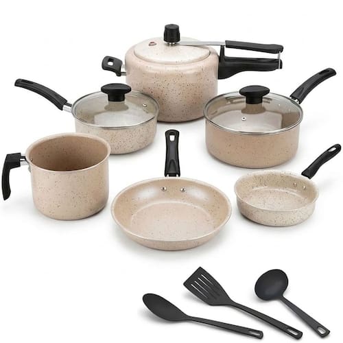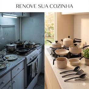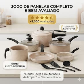 O conjunto inclui ainda uma panela de pressão de 2 litros, ideal para receitas rápidas, e utensílios em nylon, que não danificam o revestimento das panelas.