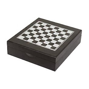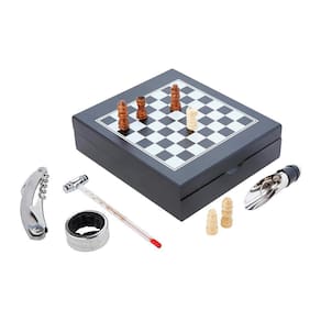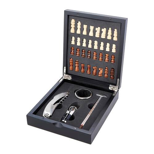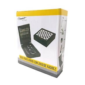 Jogo de Acessórios para Vinho + Jogo de Xadrez Mimo Style Jogo de Acessórios para Vinho + Jogo de Xadrez Mimo Style Conjunto com embalagem em formato de quadrado com um jogo de xadrez para se divertir enquanto aprecia seu vinho. Essa caixa acompanha acessórios para vinho da Mimo Style que trás os produtos exclusivos para servir os convidados com facilidade e impressionar ao mesmo tempo. Este kit possui quatro utensílios essenciais para os amantes do bom vinho, contendo:- Saca rolha;- Salva gotas em forma de bico em aço inox;- Anel calva gotas;- Termômetro. Informações:Dimensões: 4,8 x 17 x 14 cmMaterial utensílios: açõ inox e liga de zinco Pode haver alteração na embalagem em comparação com a imagem, de acordo com modificações do fabricante.