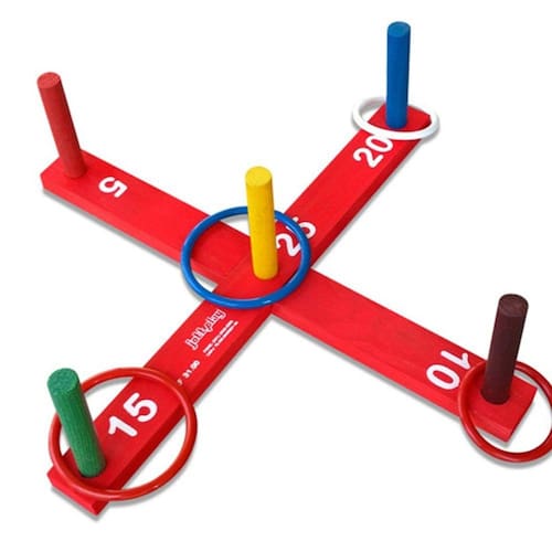 Cruzeta de madeira pintada Sendo duas bases encaixáveis que montadas medem 13x45x45cm. Cinco marcações de pontos, 5 pinos, 2 argolas grandes, 2 argolas pequenas para jogar. Tintas atóxicas. Embalagem em saco plástico. CE-BRI/ICEPEX - N 00928-96