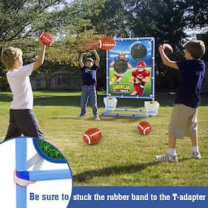 - Conjunto de jogos Football Toss: entre no confronto definitivo da end zone. O brinquedo de futebol americano vem com tudo o que você precisava: 1 alvo de futebol, 4 bolas de futebol infláveis de borracha e 1 bomba para facilitar a inflação