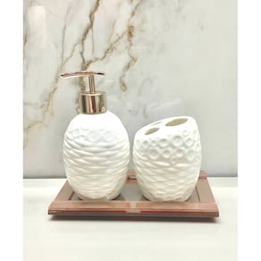 Informações Técnicas: Medidas das peças: Porta sabonete - Larg. 9cm x Altura de 17 cm. Capacidade do Porta sabonete: 400 ml com Bico dosador na cor Gold Rose. Porta escovas com 3 espaços. Peso aproximado das 02 peças:650 gramas.