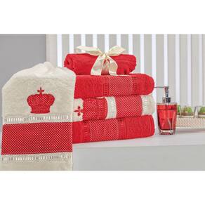 Jogo para Banho 5 Peças Nobre com Lindo Detalhe Bordado de Coroa 100% AlgodãoTrazendo a essência de seu nome, o Jogo de Banho Nobre é uma opção para quem deseja ter um produto sofisticado e que seja agradável de usar. Esse jogo de banho tem o barrado estampado e um belo bordado de coroa em suas toalhas. Ele é composto por duas toalhas de banho, duas toalhas de rosto e um piso. É um produto leve e macio que proporciona um toque suave a pele logo após o banho.Esse é um enxoval produzido com a mais alta tecnologia da Indústria Têxtil, com matéria prima de excelente qualidade, acabamento impecável e ótima durabilidade. Conteúdo da embalagem e medidas: 02 Toalhas de Banho 1,40m x 70cm, 02 Toalhas de Rosto 70cm x 50cm, 01 Piso 70cm x 50cm.Composição do Jogo de Banho: Tecido: 100% Algodão. Gramatura: 370gr m/².