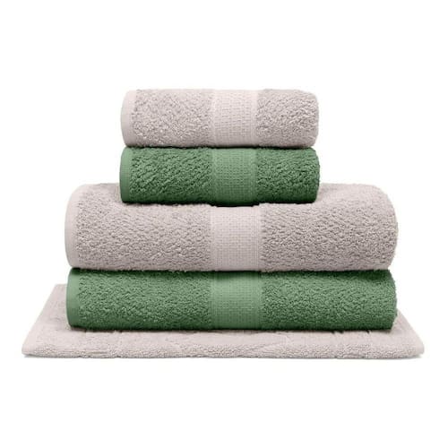 Jogo de Banho C/5 Peças Natural Gigante Cor Oliva/Bege Jogo de Toalhas 5 peças, sendo 02 Toalhas de Banho Gigante Natural, 02 Toalhas de Rosto Natural em 100% Algodão, e 1 Toalha de Piso Pezinhos, 100% Algodão, com 500g-m da linha Nobre e da marca Buettner por Bouton. Produzida em teares especiais que possibilitam desenvolver desenhos tanto no corpo quanto nas barras das toalhas. A toalha Natural possui o corpo da com efeito de 'coco ralado', criando uma sensação de maciez e conforto no uso. Esta toalha é especial para o dia-a-dia, tem excelente absorção e é muito gostosa para se enxugar. A toalha Natural da Buettner é a famosa 'Toalha Ecologicamente Correta', com anos de tradição e a mais de 20 anos sendo produzida. Contém: 02 Toalhas de banho gigante natural tamanho: 81 cm x 1,50 m; 02 Toalhas de rosto natural Tamanho: 50 cm x 80 cm; 01 toalha de piso pezinhos Tamanho: 45 cm x 70 cm; Descrição: Na cor bege: 01 toalha de banho, 01 toalha de rosto e 1 toalha de piso pezinhos; Na cor Verde Oliva: 01 toalha de banho e 01 toalha de rosto; Fibra toalhas natural: 100% algodão; Fibra piso pezinho: 100% algodão; Gramatura toalhas natural: 500g-m;