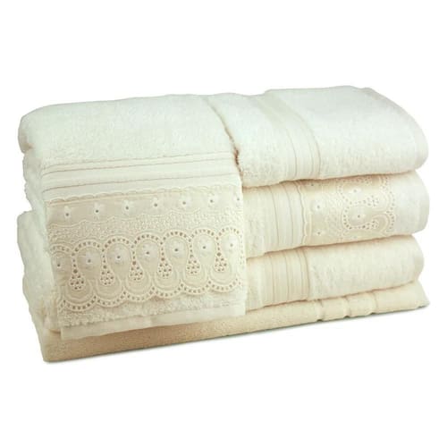 Contém: 01 Toalha de Banho com Renda 81cm x 1,50m 01 Toalha de Banho sem Renda 81cm x 1,50m 01 Toalha de Rosto com Renda 50cm x 80cm 01 Toalha de Rosto sem Renda 50cm x 80cm 01 Toalha para Pés sem Renda 50cm x 80cm