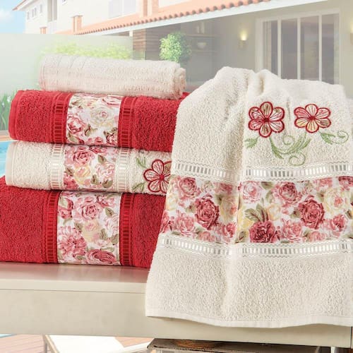 Jogo de Banho Passione Bordado Algodão 5 Peças - Vermelho/Palha - Única