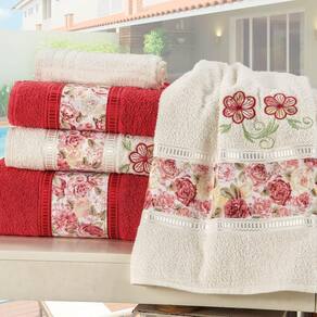 Jogo De Banho Passione Bordado Algodão 5 Peças - Vermelho/palha