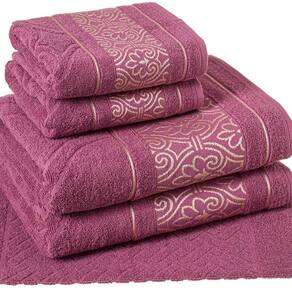 Ela é produzida com fio 100% algodão convencional de dupla torção, proporcionando melhor absorvência e suavidade. Seu corpo e barrado possuem lindos desenhos arabescos em fio metalizado dourado.