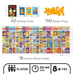 - UM ÓTIMO JOGO PARA TODA A FAMÍLIA: teste sua sorte com seus colegas fãs em sua próxima festa e noite de jogos em Garfield com este jogo de bingo incrivelmente divertido que toda a família pode desfrutar - COMBINE E GANHE! Faça uma parceria e compita em um jogo de bingo tradicional em casa ou em qualquer lugar! | Inclui 18 cartões de bingo exclusivos e 48 cartões de jogo exclusivos | 30-60 minutos para jogar | 2-18 jogadores | 8 anos ou mais | Você tem o que é preciso para ser coroado o mestre do bingo?
