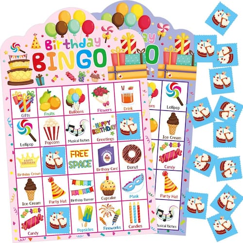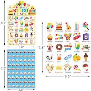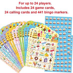Jogo de bingo de aniversário, 24 jogadores para crianças, cartas de bingo cortadas, festas, escola, sala de aula, suprimentos para atividades - O pacote inclui: 24 cartas de jogo de bingo de feliz aniversário, 441 fichas de cartão de bingo de bolo de aniversário, 24 cartas de chamada e instruções de jogo; cartas de jogador de 18 x 20,6 cm; corte facilmente ao longo de linhas pontilhadas de folhas de fichas e folhas de cartão de visita - Jogo de festa de aniversário: o jogo de bingo de aniversário é um jogo fácil para as crianças brincarem; as cartas de jogo estão cheias de personagens, símbolos e elementos favoritos de aniversário; eles adicionarão muita diversão às suas festas de aniversário - Jogo de tabuleiro popular: ótimo jogo de tabuleiro interativo para atividades escolares, festas de sala de aula, festas de aniversário de família e jogos de aniversário no escritório; ótimos presentes de aniversário para crianças e adultos - Ótimos presentes de aniversário: nossos conjuntos de jogos de bingo com tema de aniversário são adequados para crianças e adultos; ótimos presentes de feliz aniversário para famílias e amigos; escolha perfeita para sacolas de lembrancinhas de festa de aniversário - Nossas vantagens: Impressão colorida; cartolina de papel grosso; reutilizável; design perfurado, fácil de cortar ao longo de linhas pontilhadas de folhas de chip e folha de cartão de chamada; bem embalado em uma caixa